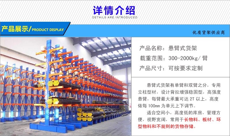 8、悬臂货架并不是一个独立的个体使用的货架,可以由多个立柱连接来组成一列货架使用,这样子每个货架单元就可以分类储存不同类别的货物,高效存储木料、管材、长条物等类似产品。立柱上面带有由3-4个悬臂和纵梁相连组成可调试钳位夹。